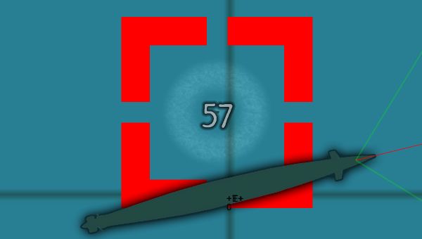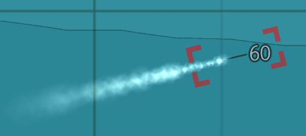 Los torpedos disparados ascenderán rápidamente a la superficie, pero cuanto mayor sea la profundidad, mayor será la distancia que recorrerá el torpedo antes de emerger. La parte roja de la línea muestra esa distancia; úsela para asegurarse de que su torpedo no pase por debajo de un barco enemigo.