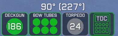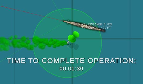 Barco objetivo: Tocar en cualquier barco enemigo para seleccionarlo como objetivo. Esto tiene el mismo efecto que centrarlo en la vista del puente: su información se mostrará en la pantalla y el sistema de control de tiro calculará una solución de torpedo para impactarlo. La trayectoria estimada del barco objetivo también se mostrará como una línea amarilla con marcadores de tiempo que muestran dónde probablemente estará en el futuro. Solo se puede seleccionar un barco como objetivo a la vez.