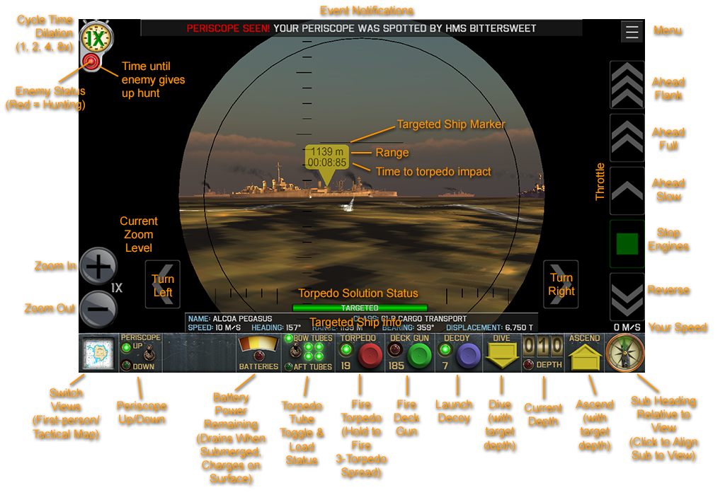 Switch to first-person view: Periscope if submerged, bridge/binoculars if on the surface. Will be disabled (greyed out) if sub is below periscope depth. Will automatically raise the periscope if it isn't up. |