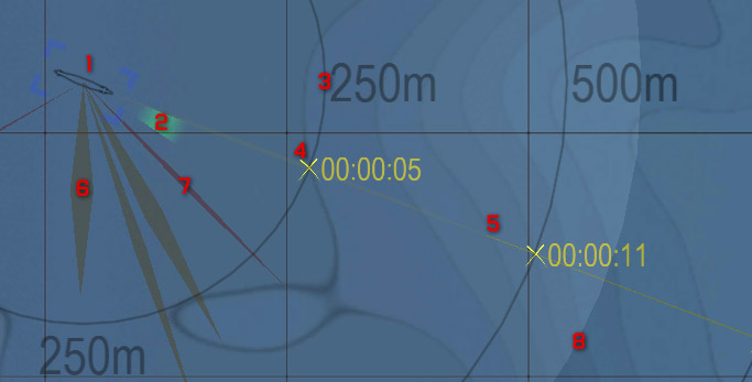 | 5 | The point at which a torpedo will reach the surface from your current depth (the torpedo track line goes from transparent to opaque). |